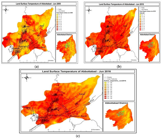 (a). LST of Abbottabad from Jun 2001–2005 (b) LST of Abbottabad from Jun 2006–2010 (c) LST of Abbottabad from Jun 2011–2016.