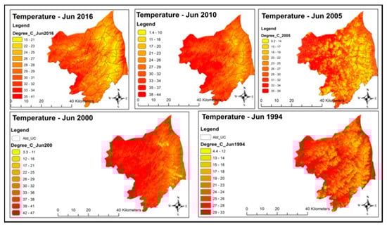 Data pertained to thermal infrared images (TIR) of Landsat 5 TM to Landsat 8 (OLI) was used in this study for LST. Data were procured from USGS resources from 1990 to 2016 with the interval of five years; the collection of data was carried out from 1994–2000 from Landsat 5 TM collection and from 2001 to 2013 from Landsat 7 ETM+ in the same pattern. The details of images for months of Jan 1994–Jan 2016 and Jun 1994–Jun 2016 are given in Table 2. Images of complete months of Jan and Jun were downloaded then all the images of each month were stacked into one image. Then images of complete five years were stacked and used for average of LST of five years.