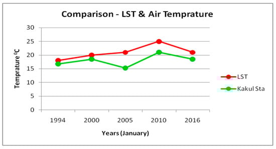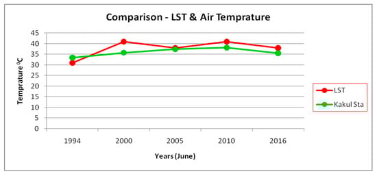 In Figure 16, a comparison of land surface temperature calculated and air temperature collected from Kakul weather station for the month of Jun is made from the year 1990 to 2016. It can be seen that as LST is increasing, so does the air temperature. LST has risen from 31 °C in 1990 to 38 °C in 2016. In the same manner the air temperature also rose to 2 °C in 26 years which is startling, even as per the international standards. We can also observe that LST is comparatively higher than that of air temperature, reason being ground and especially hard constructed surface retain more heat than that of atmosphere. Urban sprawl rise in the past 16 years without any planning has become the main reason for this alarming rise. In Figure 17, a comparison of land surface temperature calculated and air temperature collected from Kakul weather station for the month of Jan is made from the year 1990 to 2016. LST has risen from 18 °C in 1990 to 21 °C in 2016. In the same manner the air temperature also rose by 1.7 °C in 26 years. We can also observe that LST is comparatively higher than that of air temperature, reason being ground and especially hard constructed surfaces like roads and buildings retain more heat than that of atmosphere. Urban sprawl in the past 16 years without any planning has become the main reason for this alarming rise. Figure 18 gives clear comparison that microclimate change of temperature due to urban sprawl.