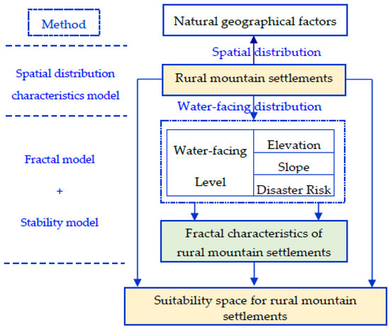 In order to identify the suitability space of rural mountain settlements and judge the impact of the water systems on rural mountain settlements distribution, the rural settlements’ spatial distribution characteristics on different natural geographical factors and the water-facing distribution of rural mountain settlements should be determined firstly. Then, the fractal dimension values of rural mountain settlements were analyzed to identify the most important factors affecting the fractal characteristics of settlements in the mountainous region and therefore identify the importance of suitable space for rural mountain settlements. The main applied methodology methods and research process (Figure 2) are as follows: