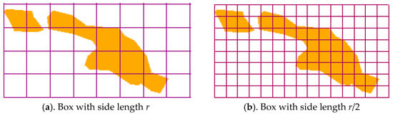 The fractal body of rural residential settlements in the south-western mountainous area is imbalanced. Therefore, we used the information-counting method [4] to calculate the information dimension of rural settlements in mountainous areas to identify the development of an orderly state, identify the spatial distribution’s equilibrium degree of rural settlements, and characterize the ability of rural residential settlements to occupy space. The information dimension of the fractal model is a generalization of the box dimension (Figure 3); that is, this covers the fractal body with a small box with a side length r or r/2, numbers each small box, and records the probability that the part of the fractal falls into the i small box as Pi. The average amount of information measured using the small box of scale r is: