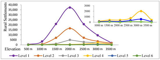 The VCM curve reflects the spatial correlation and distribution characteristics of rural mountain settlements in terms of the water-facing level and terrain (Figure 4). The overall change trend of rural settlements is the same in water-facing levels 1–6. As the elevation increases, the number of rural settlements initially increases and subsequently decreases. However, local variations in the water-facing levels are significantly different, with two major trends. At water-facing levels 1–3, the number of rural settlements is the highest at 2000 m, while at water-facing levels 4–6 the number of rural settlements is highest at 3000 m.