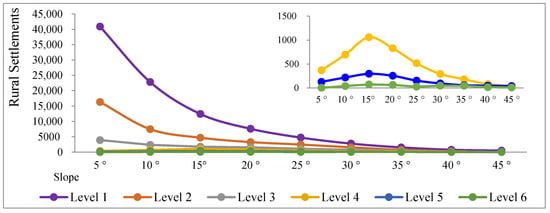 According to the VCM curve of rural settlements and slopes in terms of water-facing levels (Figure 5), the spatial correlation characteristics of rural settlements and slopes undergo similar changes. There are two major trends. At water-facing levels 1–3, the number of rural settlements decreases with increasing slope, with the highest number at the slope of 5°. At water-facing levels 4–6, the number of rural settlements initially increases and subsequently decreases with increasing slope, and with the highest number at a slope of 15°.