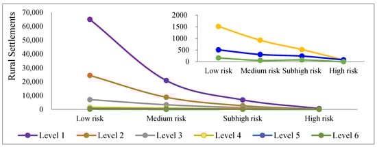 According to the VCM curve of the rural mountain settlements and disaster risk in terms of water-facing levels (Figure 6), the spatial distribution characteristics of rural settlements and disaster risk undergo similar changes. The number of rural settlements decreases with increasing disaster risk, with the highest number in the area at a low disaster risk.