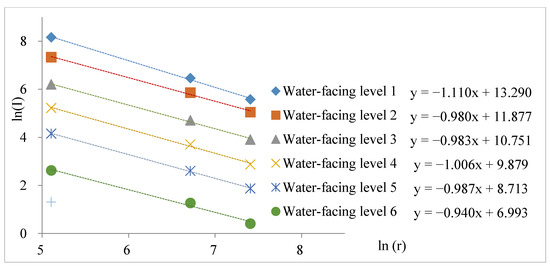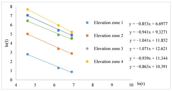 The natural geographical factors affecting the spatial distribution of rural mountain settlements mainly include elevation, slope, river, and disaster in South-Western China. Therefore, the fractal dimensions of residential points at the natural geological factors were analyzed. The grading standards for the natural geological factors are listed in Table 1—e.g., the distance grades of elevation (≤500 m, 500–1000 m, 1000–1500 m, 1500–2000 m, 2000–2500 m, and 2500–3000 m) were respectively labelled as elevation zone 1, elevation zone 2, …, elevation zone 6.