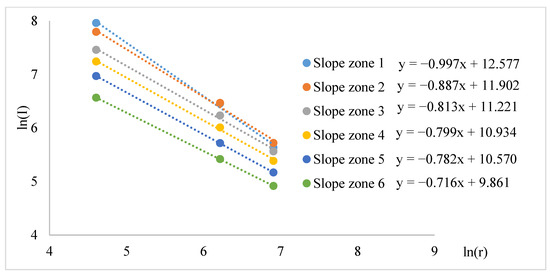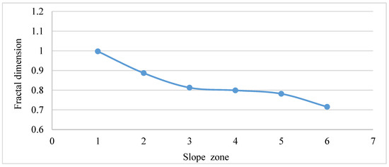 The fractal dimension value gradually decreases with increasing slope (Figure 12). In the range of slope zone 1, the spatial structure of residential areas is the most complex and the space occupation capacity is the strongest. In addition, the variation in fractal dimension at zones 1–3 is higher than at zones 4–6, indicating that the space occupation capacity at zones 1–3 is higher than at zones 4–6, with different fractal characteristics.