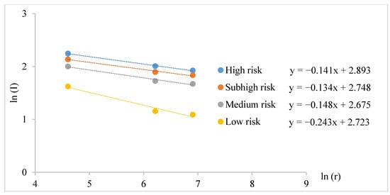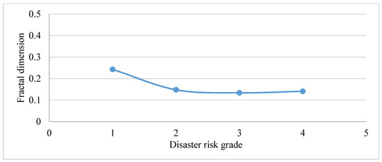 As the risk level of disasters increases, the fractal dimension value of the settlements decreases (Figure 13) in disaster risk zones. The highest fractal dimension is in disaster risk zone 1, and the distribution of settlements becomes complicated.