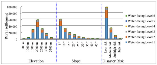 In mountainous areas, water systems play a significant role in controlling settlement distribution [17]. Restricted by the topography of mountainous areas, rural mountain settlements are situated along riversides to facilitate production and life. There is significant negative correlation (k = −1.00 ***) between water-facing level and rural mountain settlements, which means that water systems are the key factor affecting the distribution of rural settlements in mountainous areas. By comparison, most rural mountain settlements are established on the first water-facing level (Figure 15) at every elevation, slope, and disaster risk level. The first water-facing level is better than other water-facing levels for settlements, with approximately 88.03% of rural settlements being established within 1 km from the river. Therefore, we consider that the area within 1 km from the river is ideal for the site selection of rural mountain settlements because this is close to the water source and the terrain is relatively gentle, which makes it convenient for farmers to take water for irrigation. However, the mouth of the mountain gully is usually a flood passage or debris flow alluvial fan, where geological disasters are easily induced during rainstorms or extreme weather events. Therefore, to ensure the safety of life and property, areas at high risk of geological disasters within the range of 1 km from the river need to be avoided.