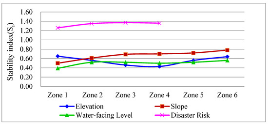 There is a significant negative correlation (k = −1.00 *) between disaster risk and rural mountain settlements. The Si of disaster risk is higher than that of elevation, slope, and water-facing level (Figure 16). To a certain extent, this indicates that disasters are one of the most important factors affecting the fractal characteristics of settlements in mountainous regions. Rural mountain settlements are most numerous in the low-risk zone with a higher Si, indicating a more stable plaque pattern in the low-risk zone. Li (2014b) [23] identified a lack of understanding relating to the appropriate selection of establishing residential areas and therefore identified the importance of locating suitable spaces for rural mountain settlements.