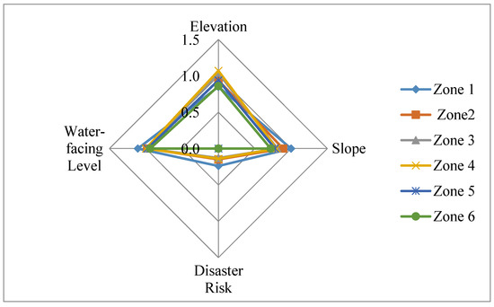 By creating a fishnet grid in ArcGIS 10.3 with side lengths of 100, 500, and 1000, the ln r and ln I values corresponding to different sizes of rural mountain settlements were obtained. The fractal dimension of rural settlements was subsequently obtained in the natural geographical factor zones. A double logarithmic regression analysis established that R2 was greater than 0.99, and the rural mountain settlements’ fractal dimension value was 1.17. The fractal dimension curve of rural mountain settlements showed that the effect of fractal dimension values separately on elevation (Figure 7), slope (Figure 8), disaster risk (Figure 9), and water-facing level (Figure 10) ranged from 0.853 to 1.071, 0.716 to 0.997, 0.134 to 0.243, and 0.940 to 1.110, respectively. Through comparison, the fractal dimension value of water-facing level is the highest. The fractal dimension value of disaster risk is the lowest.