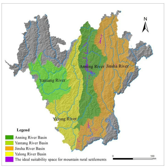 The Panxi area, located in the south-western area of Sichuan province in China, is the transition zone between the Qinghai–Tibet Plateau and the Yunnan–Guizhou Plateau to the Sichuan Basin and mainly includes Panzhihua City and the Liangshan Yi autonomous prefecture [17]. The terrain of this area inclines from the northwest to the southeast with a large height difference [18]. The mountainous characteristics of the river are distinctive, with most being deep canyons. The proportion of the passing run-off water is relatively high, accounting for 73.5% of water resources in the region [19]. Four river basins (Figure 1), including the Anning, Yalong, Yantang, and Jinsha River Basins, containing more than 90% of rural settlements in Panxi area, were selected as the research areas. Data include a Landsat Thematic Mapper remote sensing image of the Panxi area (2010) using a 1:50,000 digital elevation model (DEM) of Panxi.