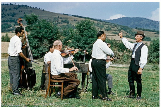 The unique way of life of the Gypsies has also attracted some artists and documentarians. In particular, black-and-white positives capturing the Roma in the Gemer region in 1924 were unearthed during a study of photographer Karol Plicka's photograph collection. Interesting documentation of the life of the Roma in the southeastern part of Slovakia in the 1930s and 1950s is presented by the works of Václav Fiala [79]. Josef Polák also photographically documented various ethnographic and ethnological subjects, including the life of the Gypsies. The culture of the Gypsy ethnic group was popularized and made more comprehensible by Jozef “Fintický” Kolarčík, who compiled the most comprehensive collection of documents on the Gypsies’ way of life. Despite the richness of material and spiritual expression of the Romani culture, the Centre for Folk Art Production [72] registers only one Roma artist in Gemer in the Register of Producers of Folk Art Production. The Traditional Folk Culture Collection [71] lists for Gemer only “Romani Folk Music Musicians from Revúčka” (1974), “Bráčista Anton Anderko from Revúčka” (1976) and “Folk Music from Slavošovce” (1969, Figure 4). Other elements, e.g., the folk dance “Volunteer Dance from Vlachov” (1974), are accompanied by gypsy music. However, the documentation of these elements took place about 50 years ago. Therefore, the Centre for Folk Art Production should cooperate with Romani artists and support the preservation of their unique culture in the present day as well. The Traditional Folk Culture Collection should also pay more attention to the documentation of Wlachike Romani traditional culture, language, customary law, and intergroup relations, and the culture of other Roma groups. The Romani language in the Czechoslovak area, which has 13 dialects, also deserves attention [30].