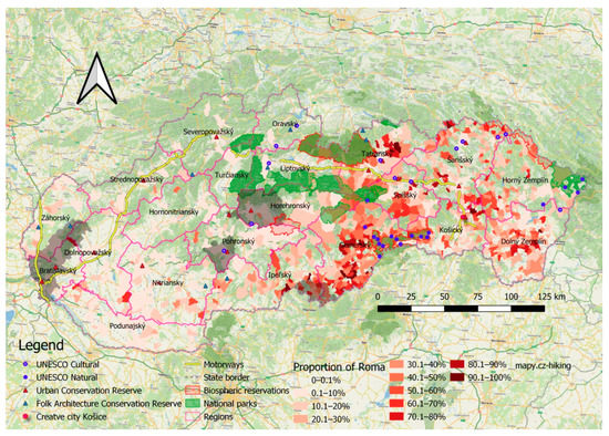 - Roma culture—The population dynamics of the Roma, and their activity in the labor market, level of education, dependence on social assistance, health status, and crime levels have been addressed by a number of publications, but only a few literature analyses are devoted to their history and culture and the discrimination and marginalization they face in Slovakia [5,6,7,8,24,27,29,56,57,58,59,60,61]. The study of the heritage of Roma culture offers a great wealth of resources for tourism development, e.g., traditional Roma music and crafts. At present, opportunities for tourism development are provided by municipalities that seek to preserve Roma culture on the basis of an application for financial support from the Fund for the Support of the Culture of National Minorities.