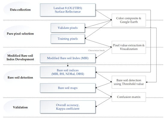 Figure 1 presents a flowchart that describes the procedures of development and validation of the modified bare soil index from data used to output. Each step is discussed in detail below.