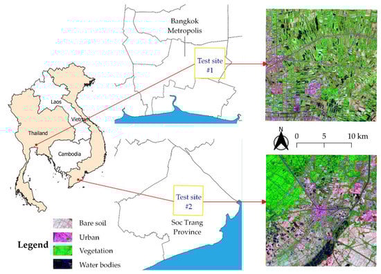 We chose the eastern Bangkok metropolis (Thailand) as the first test site (test site #1) because this is a semi-urban region with heterogeneous urban and annual agricultural landscapes, which become seasonal bare land in the fallow period [55] (Figure 2). The concentrated and smaller-size residential areas are interspersed with the fields due to the suburbanization process [56]. The second site (test site #2) is located in central Soc Trang province, a local city in the Vietnamese Mekong Delta, where most agricultural land is double-cropped rice or a rain-fed rice system [57]. The immense paddy fields become seasonal bare soil during the dry and salinity intrusion periods. Both test sites are located in flat low plains and distributed over the Gley soil (Gleysols-GL) based on the World Reference Base for Soil Resources (WRB) [58,59]. Specifically, the test sites are square with a 20 km edge and dominated by four major land cover types (i.e., bare soil, built-up, vegetation, and water bodies).