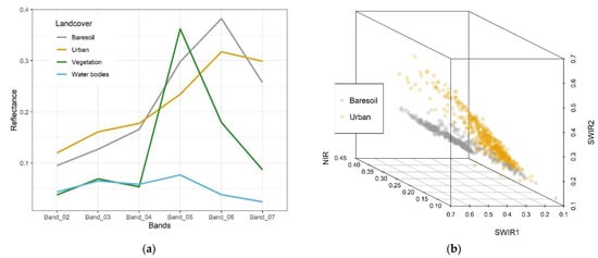 (a) Spectral profiles show reflectance properties of different land cover types; (b) 3D plot presents spatial separation of bare soil and built-up samples based on reflectance values in NIR, SWIR1, and SWIR2 bands. Orange and gray dots represent bare soil and built-up samples, respectively.