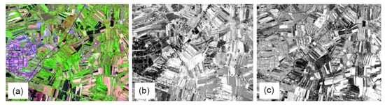 Magnified images (a) false-color composite (RGB: 7-5-3) with pink and prune representing built-up and bare soil, (b) normalized image on SWIR1 and SWIR2 (Equation (1)), which mostly highlights vegetation with bright tone, bare soil in gray and urban areas in black, and (c) three-band bare soil index (Equation (2)) emphasizing bare soil (bright tone), urban features in gray and vegetation in black.