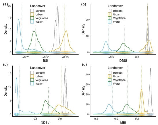 The density graph illustrates the density distribution of four land cover types for (a) bare soil index (BSI), (b) normalized difference bareness index (NDBaI), (c) dry bare-soil index (DBSI), and (d) modified bare soil index (MBI). Dash lines present mean values, and darker zones on horizontal show more concentrated data zones.