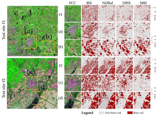 Spatial distribution of bare soil layers extracted from BSI, NDBaI, DBSI, and MBI on entire test sites and zoom-in areas in solid line squares where there were significant differences among the indices compared to FCC images: (a,b) Test site #1, (c,d) Test site #2.