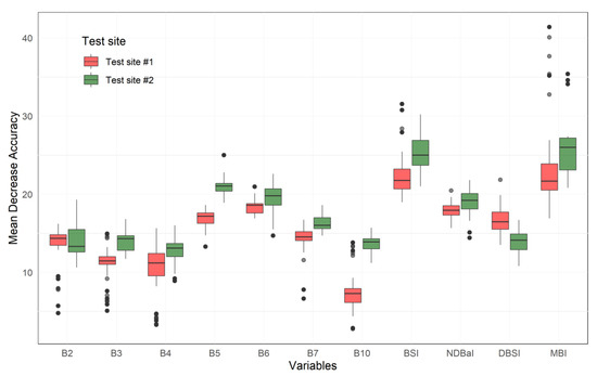 Figure 8 shows the important variable assessment using the RFC that reveals the MDA in test site #1 which is generally lower than the value in test site #2. The more extensive the bare soil areas are, the more misclassification there is liable to be. MBI is the most significant contributor to the classifier in comparison to the multispectral bands and three bare soil indices. The classification accuracy decreases by 28 ± 14.6% in test site #1 and 26.3 ± 4.2% in test site #2 without MBI. In test site #2, the accuracy drops by 77.1% without the contribution of MBI. The contribution of BSI is noticeable with the MDA about 22.7 ± 3.3% and 25.1 ± 2.3% in test sites #1 and #2, respectively. It is followed by the NDBaI with a small difference in MDA between the two test sites. The DBSI efficiency is relatively low in this test when its MDA lies between 14 ± 1.5% (test site #2) and 16.6 ± 1.3% (test site #1). Among the individual spectral bands, the TIR wavelength is indicated as the least contributing variable for the classification.