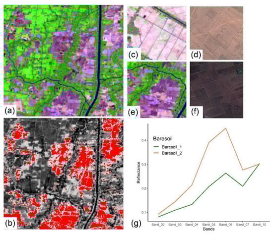 There are two kinds of bare soil which are visible in a color composite image, namely dry and humid bare soil (Figure 9c–f). The dry bare soil (type #2) has a high reflectance value in shortwave infrared wavelengths, while humid bare soil (type#1) has a low reflectance value in these wavelengths, absorbed by high moisture content (Figure 9g). Therefore, the humid bare soil is identified as urban features (Figure 9a,b). When we reduce the MBI thresholding value to select the whole area of humid bare soil, several urban areas are misclassified. Fortunately, the humid bare soil is uncommon in both test sites, so it does not significantly affect the general bare soil extraction. Despite this, future studies should continue to seek an index or technique to complete the distinction between urban areas and wet bare soil for research in urban, semi-urban, and countryside areas.