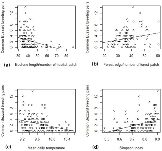 The influence of mean daily temperature on the Common Buzzard’s breeding abundance is the opposite of another study conducted in Finland [46]. However, this analysis could also be influenced by the temperature segregation in the study area, which is conducted by geographic features from the study area. The southern part of the study area shows higher temperatures, but this region is less suitable for Common Buzzards due to very small, or even without forest patches, being covered mainly by open habitat. The middle and the northern part of the study area have larger forest patches ensuring good nesting opportunities.