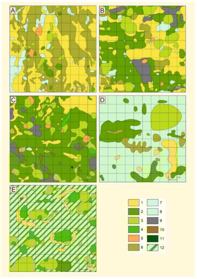 Species area covered - (A)—plot I, (B)—plot II, (C)—plot III, (D)—plot IV, and (E)—plot V: 1—sand cover; 2—Polytrichum piliferum; 3—Salix arenaria; 4—Pinus sylvestris; 5—Salix acutifolia; 6—algal community; 7—Corynephorus canescens; 8—Koeleria glauca; 9—accumulation of organic matter; 10—Juniperus communis; 11—Betula pendula; 12—K. glauca and P. piliferum.