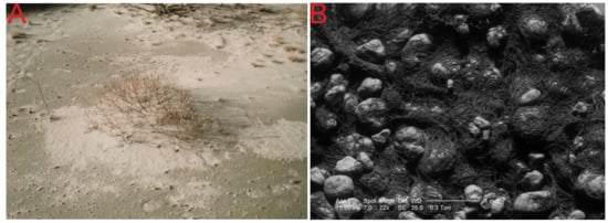 (A) Sand colonisation by algae; (B) Algal net binding sand grains and stabilising loose sand (SEM photograph).