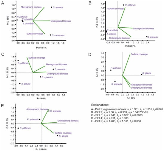 The values of the variables of this principal component were characterised by a high degree of correlation (r = 0.99). Thus, the first axis captured the ratio between above- and belowground biomass. Vegetation with high scores on this axis was characterised by a significant share in the production of biomass at this stage of succession. PC2 was interpreted as the relationship of the axes of the belowground biomass/surface coverage of dominant species. The variables for Plots II (r = 0.92) and III (r = 0.93) also showed a high correlation coefficient with lower variance (Figure 3B). In this case, PC1 is also interpreted as the relationship between above- and belowground biomass and the second axis as the relationship between the belowground biomass and surface coverage of the dominant species ratio. Other plots showed lower levels of variation: Plot I, 63%; Plot V, 60%.