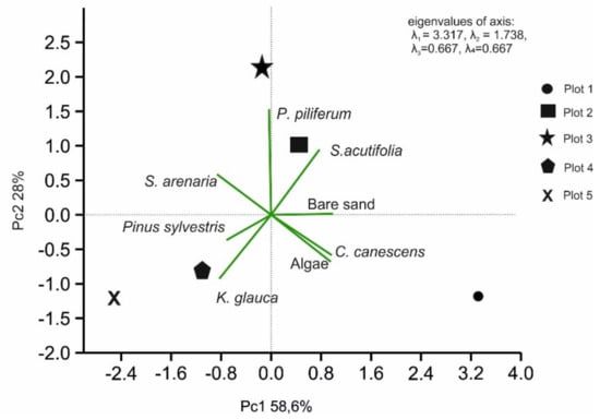 Moreover, using PCA analysis, we studied the compound dependence of land cover through dominant plants and the occurrence of sandy soil for the five-plot study. In this case, the pattern of four variable outputs can also be described using one combination of PC1, the variance of which is 58.6% (Figure 6). Based on the scree plot, PC2 can be used for dependence analysis (28% value of variance). PC1 is defined as the ratio of the participating species C. canescens and algae for individual plots. The PC1 variables showed a strong correlation (r = 0.99). The second axis was interpreted as the relationship between C. canescens and sandy surfaces (r = 0.86).
