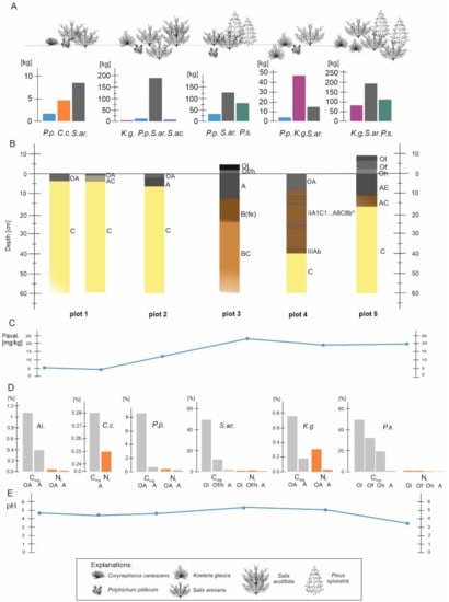 Available phosphorus (Pavail), as a deficit element for plant development in extremely poor sandy habitats of the studied area, plays an important environmental role. Its maximum contents were found in organic and organic-humus horizons, where they ranged from 10.41 to 65.23 mg/kg. Notable participation of Pavail was also observed in the soil mineral horizons under K. glauca (24.10 mg/kg) and S. acutifola (25.11 mg/kg). It did not differ significantly in the remaining horizons (Table 9).