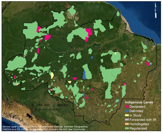 According to Brazil’s Federal Constitution, Indigenous Lands (ILs) are territories demarcated to guarantee Indigenous peoples the right to their lands, their livelihood, and their social organization [1]. Under Brazil’s law, the Indigenous peoples have the original right to exclusive use of the lands they traditionally occupy [1,2,3]. The Brazilian Legal Amazon region (the so-called Brazilian Legal Amazon (BLA) is a political-administrative region covering approximately 5 million km. The BLA comprises the states of Acre (AC), Amapá (AP), Amazonas (AM), Pará (PA), Rondônia (RO), Roraima (RR), Mato Grosso (MT), Tocantins (TO), and part of Maranhão (MA) [4]) shelters the world’s largest concentration of Indigenous peoples, divided into several ethnic groups and holding a rich socio-cultural diversity. In this region, approximately 355,000 Indigenous people, divided into 155 ethnic groups, inhabit 383 Indigenous Lands [1,5].