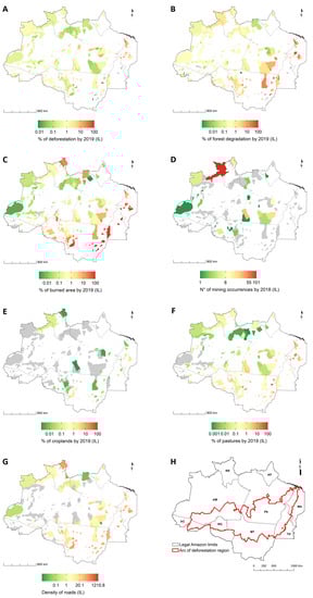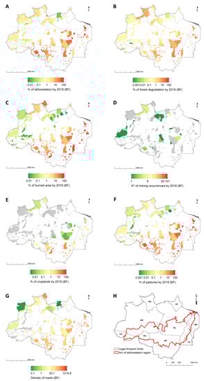 Environmental threats in the buffer zone of Indigenous Lands. Accumulated deforestation by 2019 (%) (A); Accumulated forest degradation by 2019 (%) (B); Accumulated burned area by 2019 (%) (C); Number of mining occurrences by 2018 (D); Croplands by 2018 (%) (E); Pasture by 2018 (%) (F); Road density (km/km) (G); and the Legal Amazon region limits (H). The maps are displayed on a logarithmic scale. Gray indicates ‘threat value’ = 0. Data sources are provided in Table 1.