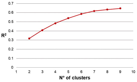 The most suitable number of clusters was calculated as follows. Initially, the K-means clustering method was performed with different numbers of clusters (2–9). The results of each partitioning were applied in an one-way ANOVA as the dependent variable and the environmental threat indicators as independent variables. From the ANOVA results, the coefficient of determination () was calculated by the ratio of the inter-cluster variance (sum of the squares among the groups) and the internal-cluster variance (sum of the total squares for each variable) [80,82]. The choice of how many clusters to use was made based on the value of () in order to optimize the variability gain with the increase in the number of clusters.