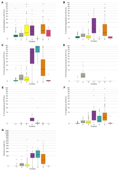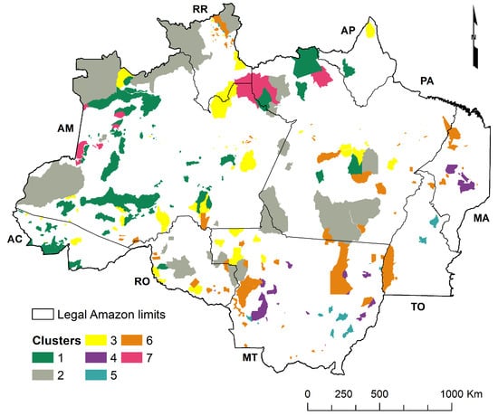 Cluster 7 is mainly characterized by the predominance of mining in the ILs’ buffer zones (Figure 6G and Table A2). The ILs in this cluster also face deforestation inside and outside their limits, as well as forest degradation, fires, pastures, and roads in the ILs’ buffer zones with lower intensity. The 16 ILs in cluster 7 are distributed further north of the Amazon region, in the states of Amazonas (AM) and Pará (PA) and, therefore, further from the arc of deforestation (Figure 5). These ILs cover about 65,018 km (5.5%).