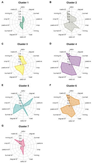 Radar charts of the clusters of Indigenous Lands (A–G). The values are plotted to represent the the mean of each threat for each cluster. To improve the visualization of the results in this graph, we apply the logarithmic transformation followed by scaling between 0 and 1 (using the min-max method) on the original variables. The central axis delimits the environmental threats in the buffer zone (left) and within the Indigenous Land (right). Threats in the buffer zone are identified by the abbreviation ‘bf’. The term ‘defor’ is an abbreviation for deforestation and ‘degrad’ for forest degradation.