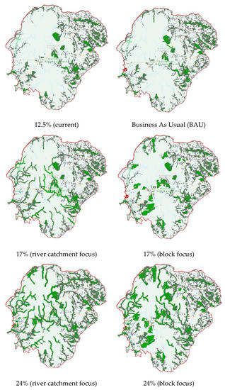 Scenarios representing three different levels of tree cover were illustrated in map form using ArcGIS (Figure 1) []. Visualisation is recommended for future scenario research []—something that maps can partially achieve. The maps depicted the current tree cover (12.5%), ‘Business As Usual’ (BAU), the CCC’s minimum recommendation of 17%, and CAT’s 24% recommendation. Two approaches for achieving these were represented to stimulate conversation around expansion pattern; these were (a) focusing on planting trees along river catchments and (b) focusing on block plantings.