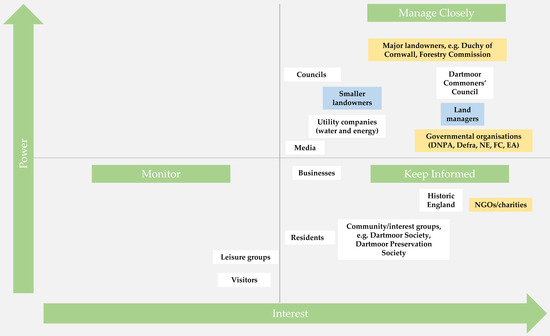 A stakeholder matrix based on axes of influence and interest mapped the stakeholders of the Dartmoor National Park, UK. Interviewees are representative of the blue (farmers) and yellow (key informants) stakeholder boxes.