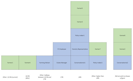 The groups differed most in their assessment of the forestry benefits that are offered by trees. Five key informants discussed benefit, such as increasing timber self-sufficiency, biomass and additional sources of income for land managers, whereas only two farmers mentioned these. The need to expand the UK’s timber industry is detailed by the CCC’s Land Use report [], but the report’s Chair highlights the contrasting skillsets of farmers and foresters []. Unless farmers are interested in acquiring forestry skills, or sub-contracting, they may not perceive forest-crop benefits of increased tree cover.