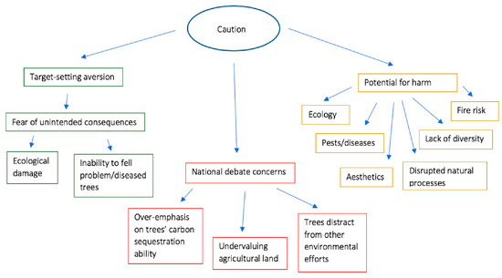 Concern over the global rush to plant trees was repeated in nearly all interviews [,,,,]. This caution revolved around three things: target aversion, concern over the current national debate, and the potential for harm (Figure 4).