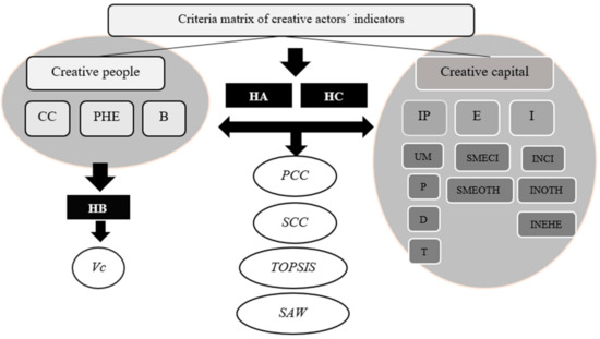 The main goal of the paper was—as was mentioned before—to identify the distribution of creative actors across the regions in Slovakia, to investigate the nexus between creative actors, and to evaluate their impact on the regional development in Slovakia. The exploratory scientific research on creativity in Slovak regions is based on a consistent literature review, statistical analysis, comparisons, and evaluation of comprehensive data sets. Firstly, we set a criteria matrix of creative actors’ indicators, which consists of two groups of indicators identifying the creative people and creative capital in a region. The creative people part of the matrix consists of creative class (CC), population with higher education (PHE), and Bohemians (B). Creative capital consists of indicators related to Intellectual Property (IP), Entrepreneurship (E), and Innovation (I) and their sub-indicators as defined above. Verification of the Hypothesis 2 (H2) is based on a comparison of indicators which belong to the creative population via the Variation coefficient (Vc). For the verification of the Hypothesis 1 (H1) and the Hypothesis 3 (H3) we employed the Pearson and Spearman correlation coefficients (PCC, SCC), the TOPSIS and SAW method. The robustness of methodology used in this paper and the exploitation of the repertoire of mathematical and statistical methods is the main valuable contribution of this paper.