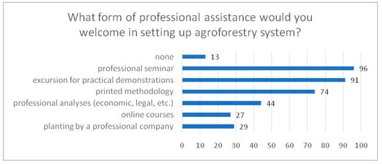 An important and recurring condition for founding agroforestry systems is that it would not be necessary to change the technical equipment of the farm in order to maintain the trees, or to significantly interfere with the other production sections of the land (cf. [43]). The farmers who participated in the research (and were not totally opposed to agroforestry) also requested a complex expert evidence-based information campaign to complement any arising policy. In the questionnaire survey they preferred education in the form of educational field trips, educational seminars and a paper-based handbook (see Figure 3). The farmers had similar requests during the in-depth interviews—they wanted to consult experts about the specifics of planting, harvesting, the types of trees to be planted, the design of the system, the crop combination, where to obtain seedling material, what products to focus on and where to find a market for them. Regarding the new policy, the majority of the farmers in the in-depth interviews feared that the rules will be too rigid, with insufficient room to design systems flexibly in accordance with local specificities and farming regimes. For example, they would appreciate the opportunity to grow their own seedlings, rather than buying larger quantities from other suppliers.