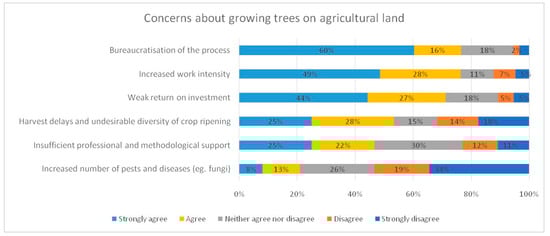 Farmers also have concerns regarding the administrative burden of the bureaucratic process of the introduction of agroforestry practices (cf. [43]). Ownership and tenancy legislation, as well as the system of subsidies, are widely perceived as significant obstacles. It is complicated for farmers farming on leased land to plant trees there. Other farmers see the threat of losing direct payment subsidies, which are still bound to tree-less areas. There is also a widely shared view that planting trees requires a long-term investment, in addition to the uncertainty as to whether seedlings will root and grow well—the farmers surmise that the positive effects of trees in the landscape will not be seen for several years or decades, if at all (see Figure 4).