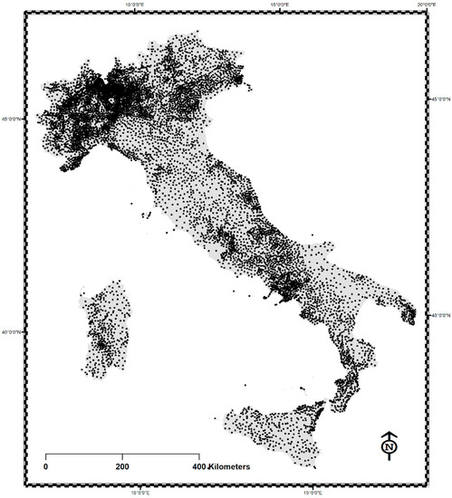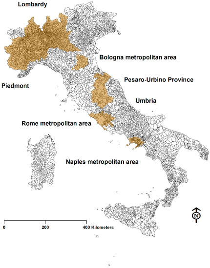The Italian municipalities, demographic data, and any information regarding urbanisation were extracted from the ISTAT database with the territorial and administrative variations of municipalities, metropolitan cities, provinces, and regions and were updated and published on 6 April 2018 (http://www4.istat.it/it/archivio/209722, http://demo.istat.it/ (accessed on 25 January 2021)).