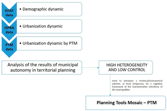 In general, municipal plans always abound, correctly, with demographic projections in support of hypothetical new and extended residential and production areas, both when the population or the economic sectors register an increasing trend, but also when such projections are objectively contradicted by a long developmental series of negative indicators. For this reason, a comparison analysis was carried out on demographic dynamics, urban dynamics, and potential urban dynamics (extracted from the available PTMs). In fact, for the formulation of the PTM, this analysis was fundamental in highlighting the incongruity between urban growth and the actual need for settlement, caused above all by the low control of urban policies in the management of urban transformations. Figure 3 shows the applied methodology.