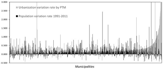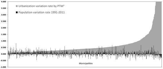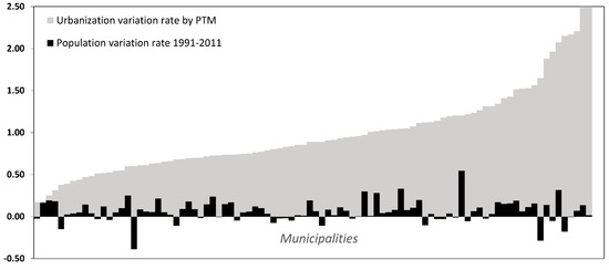 This statement can be verified using the sample of the Umbria Region, for which an accurate and updated PTM is available [23]. The 92 municipal plans of the region, more than half of which were updated after 2010 and another 23 after 2005, with very few exceptions, predicted an increase in the current urbanised surface area from 50 to 150%, with some municipalities pushing to exceed even 200–250% (Figure 4). These are extremely high rates, as they both include municipalities with a serious demographic increase over the last twenty years (but which exceed 20% in one case only), but also a very large number of municipalities with very contained or stable increases (<5%), or even with strong decreases, including ones near to or greater than 10%. Essentially, there is no correlation between historic series of demographic dynamics and developmental population scenarios which each individual municipality may propose in justification of the provision of residential or productive spaces. In the Umbrian case, which currently shows a per capita urbanisation of approximately 350 m2/inhabitant, the increase in urbanisation itself predicted by the plans (84% more) would correspond to almost double the current 884,000 inhabitants over a time horizon of 10 to 20 years: a hypothesis of 3.5% per year is completely unreasonable, considering the demographic trend of the last fifty years with an average rate of 2‰.