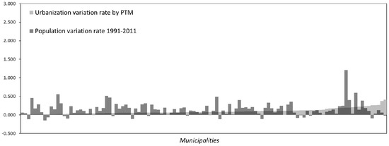 Demographic dynamics for the period 1991–2011 compared to the rate of urban increase per individual municipality according to their planning tools inserted in the Lombardy region PTM. (Municipalities with Urban Density (UD) >50%).