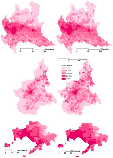 The situation described for Umbria refers to a sample of municipalities of an urban density (UD) varying from 3% to a maximum of less than 10% (average regional UD = 5%), but some findings are quite different coming from investigations in the municipalities of Lombardy, the Italian region, along with Veneto, with the highest average rate of UD (approximately 14%). The more than 1500 Lombardy municipalities, with the lowest average size in Italy (15.74 km2), boast very high levels of urbanisation of up to 94%, with nearly 500 having above 25% (one quarter) of their territory covered by settlements. The theoretical scenario of the plans implemented would see the urban density of Lombardy rise from 14 to 16%, with an increase in the urbanised surface area of more than 500 km2, which represents 15% more than the current urban extension extracted from the DUSAF (just over 3300 km²).