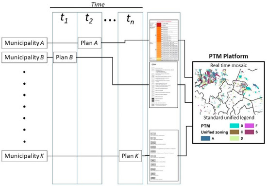 As already anticipated in the introduction, a PTM contains the summary of the contents of individual municipal planning tools, using a unified legend obtained from the interpretation of the zone assignments indicated in the source documents. In this way, the zoning of n plans that flow together into PTMs are welded into a single layer accompanied by a single database. Of course, it would also be possible to prepare a simply spatial PTM, maintaining the original synoptic items of the individual plans, but this would compromise the searchability of the device relative to the macroscopic effect deriving from the summary of the indications of the individual municipalities. As a consequence, the PTM generally follows the technical procedure shown in Figure 9.