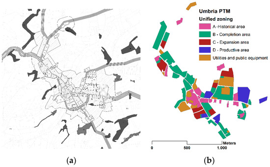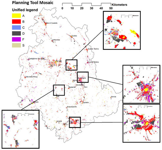 It presents a series of non-banal technical problems tied to the preparation of the standard, unified legend due to the difficulty of homologating the various use assignments with respect to the national definitions (homogeneous zones Ministerial Decree 1444/68). Figure 10, Figure 11 and Figure 12 show the results in the case of the Umbria region, with detail on each individual municipality, the unified legend, and the regional framework obtained. Both the regulatory plans of the municipalities, and as a consequence the PTMs when existent, do not follow rules for the standardisation of symbols and definitions. Therefore, it is currently extremely complex, both to construct the mosaics and then to compare them among various administrative territories [28,29].